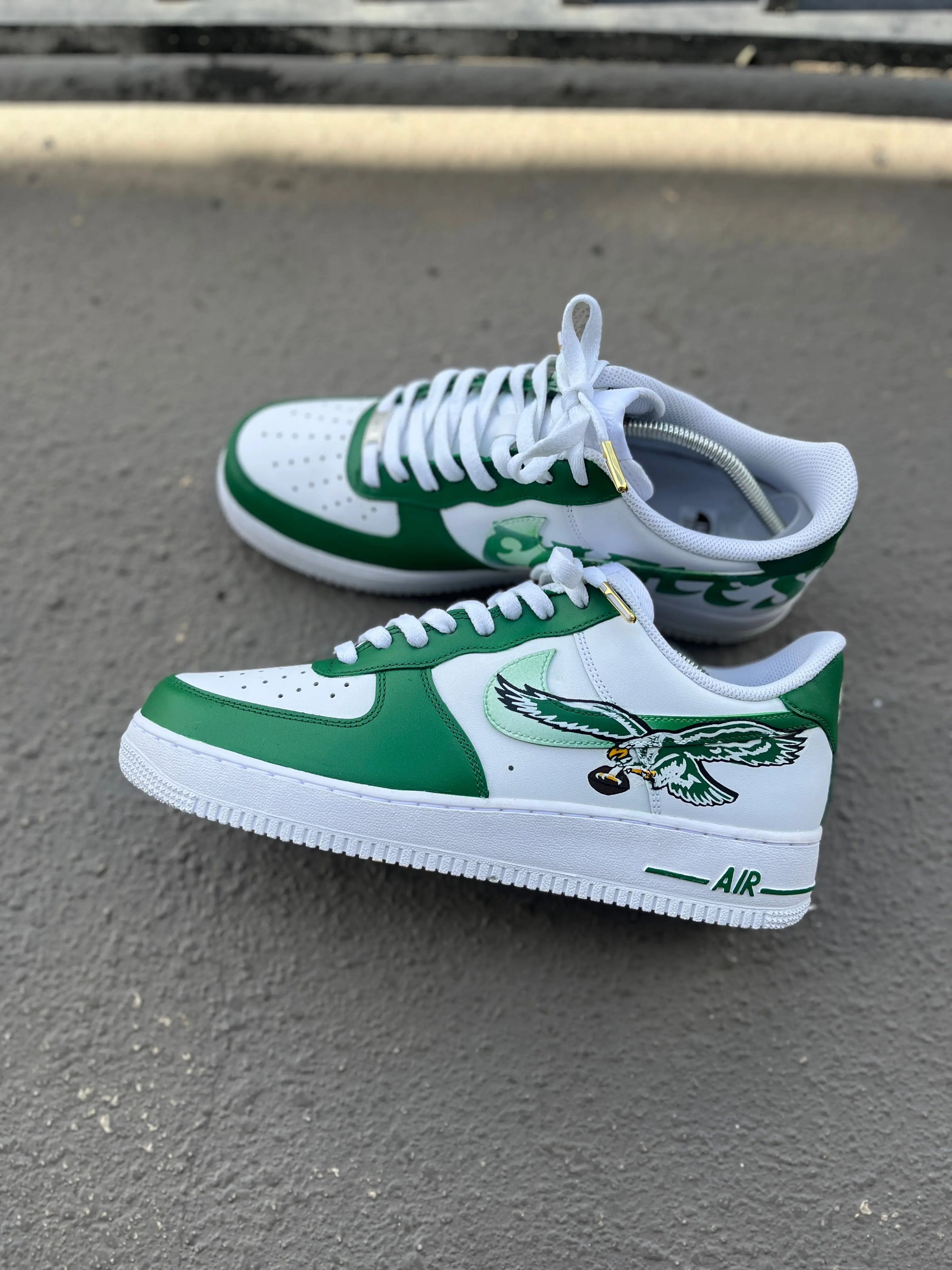 Custom Philadelphia Eagles Themed Air Force 1s. This price includes purchasing the sneakers. All Adult sizes are for both Men and Women. All prices are USD. Color Shade of shoe may vary on screen versus in person and under different lighting.
